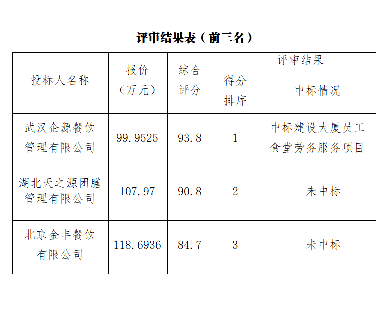 ? ? 經(jīng)評審,綜合評分排名第一為武漢企源餐飲管理有限公司,報(bào)價(jià)為99.9525萬元/年,綜合評分93.8中標(biāo)武漢市政工程設(shè)計(jì)研究院有限責(zé)任公司建設(shè)大廈員工食堂勞務(wù)服務(wù)項(xiàng)目。