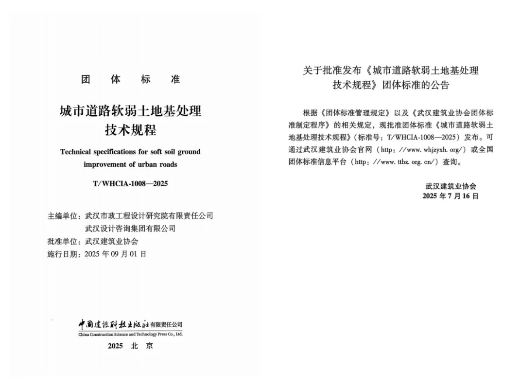 武漢市政院與武漢設計咨詢集團聯(lián)合主編的團體標準《城市道路軟弱土地基處理技術(shù)規(guī)程》,已由武漢建筑業(yè)協(xié)會批準發(fā)布。該規(guī)程是國內(nèi)首部專門針對城市道路軟弱土地基處理的技術(shù)標準,有效解決了現(xiàn)行建筑與公路規(guī)范在市政道路工程中存在的諸多不明確、不統(tǒng)一的應用問題。其內(nèi)容系統(tǒng)全面,兼具實用性與先進性,既體現(xiàn)了市政行業(yè)特色,又契合城市道路實際建設需求,對湖北省內(nèi)城市道路軟弱土地基處理的設計、施工、關(guān)鍵技術(shù)方法及檢測監(jiān)測等方面提供了權(quán)威依據(jù)與科學指導。該《規(guī)程》整體達到國內(nèi)先進水平,在行業(yè)與省內(nèi)居于領(lǐng)先地位。它的發(fā)布進一步鞏固了武漢市政院在市政巖土工程領(lǐng)域的技術(shù)優(yōu)勢,顯著提升了公司的行業(yè)影響力與核心競爭力。