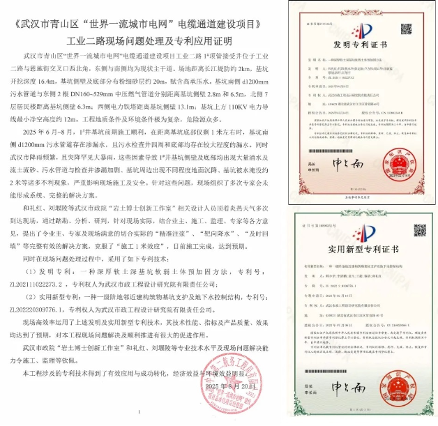 發(fā)明專利“一種深厚軟土深基坑軟弱土體預加固方法”(專利號:ZL202111022273.2)與實用新型專利“一種一級階地鄰近建構(gòu)筑物基坑支護及地下水控制結(jié)構(gòu)”(專利號:ZL202220309776.1),在武漢市青山區(qū)“世界一流城市電網(wǎng)”電纜通道建設項目——工業(yè)二路現(xiàn)場問題處理中實現(xiàn)了高效應用。兩項專利的技術(shù)性能、實施效果及產(chǎn)品質(zhì)量均達到預期目標,成功完成了技術(shù)轉(zhuǎn)化,展現(xiàn)出良好的經(jīng)濟效益與環(huán)境效益。