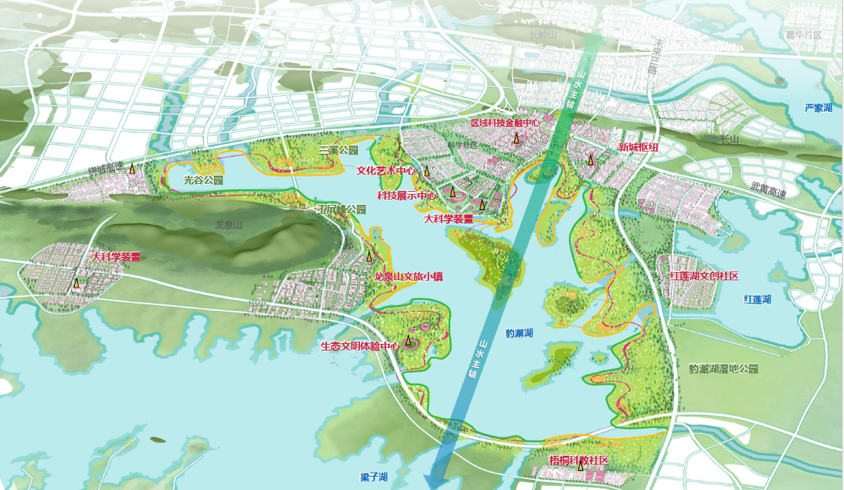 ? ? 豹澥湖位于武漢新城的山水景觀主軸,是武漢新城構建“看山望水、疏朗通透”景觀視廊體系的重要節(jié)點,也是武鄂黃黃核心區(qū)南部湖區(qū)生態(tài)空間的重要組成部分,是大江大湖群山富集之地,流域的系統(tǒng)化治理也是推動武鄂黃黃一體化建設的關鍵性實踐。以科學島為核心的環(huán)豹澥湖科創(chuàng)圈已初具規(guī)模,豹澥湖流域將是武漢新城區(qū)域內未來最具發(fā)展?jié)摿Φ暮诵膮^(qū)。