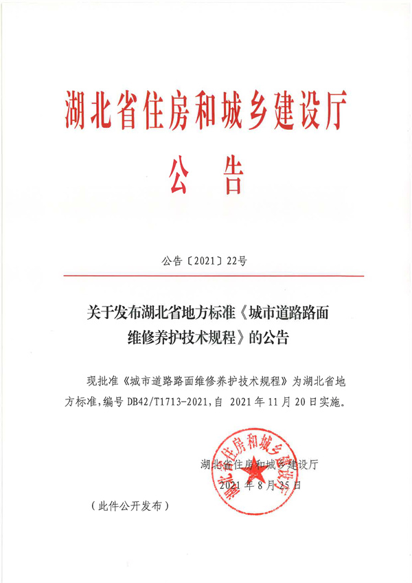 由我公司牽頭起草的湖北省地方標(biāo)準(zhǔn)《城市道路路面維修養(yǎng)護(hù)技術(shù)規(guī)程》(編號:DB42/T 1713-2021)于2021年7月20日由湖北省住房和城鄉(xiāng)建設(shè)廳、湖北省市場監(jiān)督管理局聯(lián)合發(fā)布,并于2021年11月20日起實(shí)施。