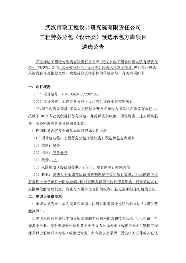 武漢市政工程設(shè)計(jì)研究院有限責(zé)任公司工程勞務(wù)分包(設(shè)計(jì)類)預(yù)選承包方庫項(xiàng)目遴選公告