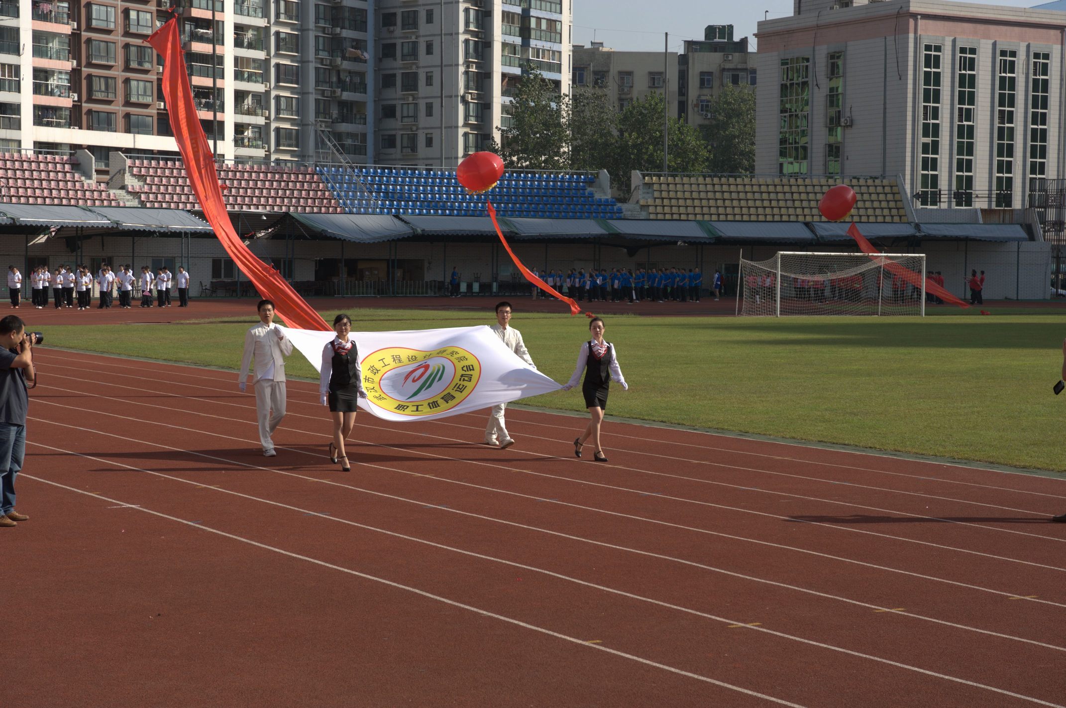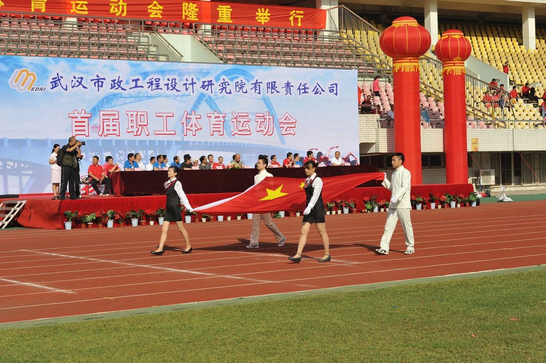 ??? 9月28日的漢口體育中心,彩旗飄揚,樂聲陣陣,在“我運動,我健康,我快樂”的巨幅背景前,紅色的主席臺被妝點得分外喜慶,十只巨大的彩色氣球懸掛著運動會的宣傳標語,烘托出熱烈的比賽氣氛。武漢市城建委黨組副書記、副主任熊明亮,武漢市城建委總工程師、首席市政工程專家龍世平,武漢市城建委工會主任朱宗信應邀出席了開幕式,公司領導和各部門負責人在主席臺就坐。