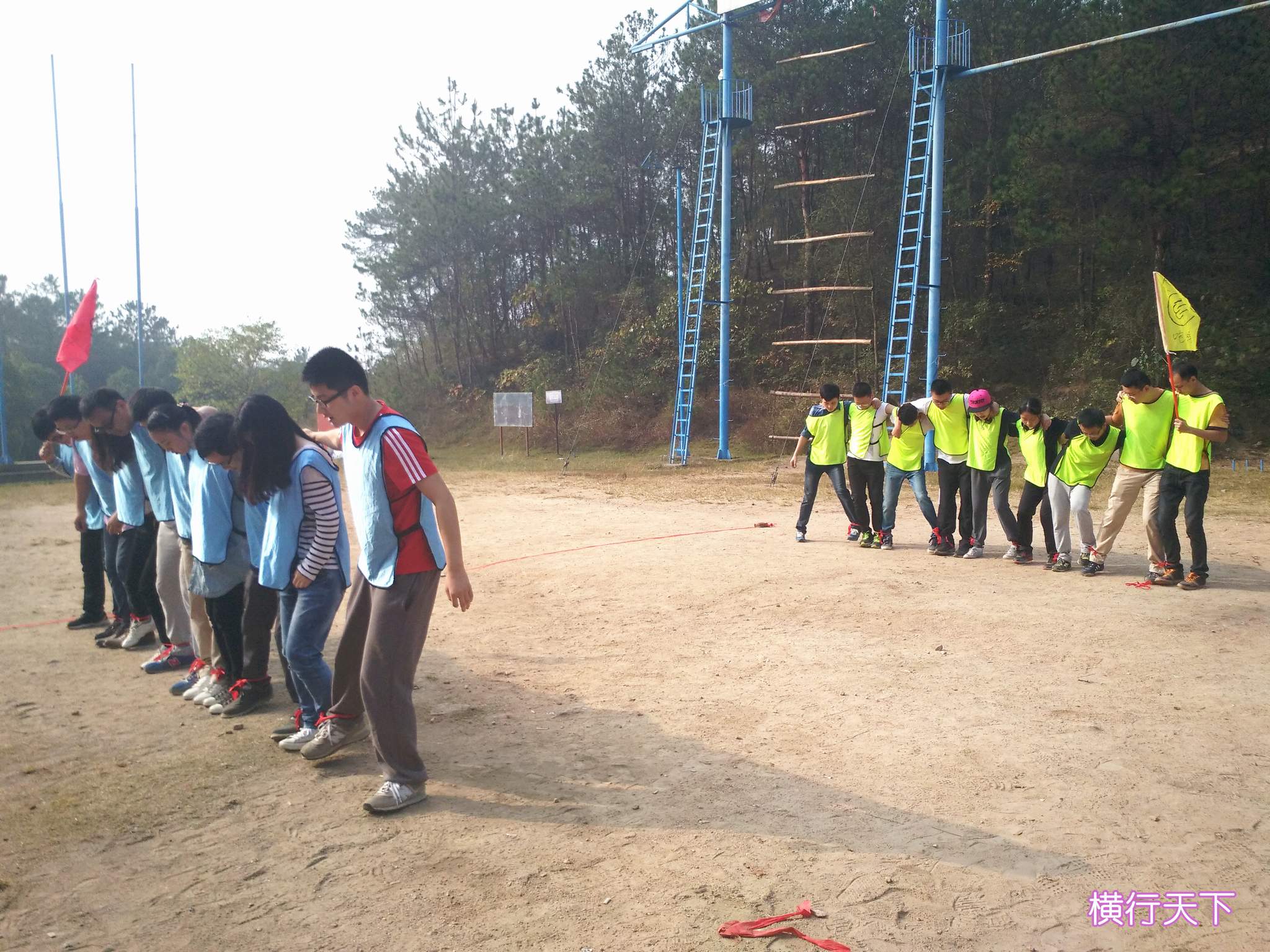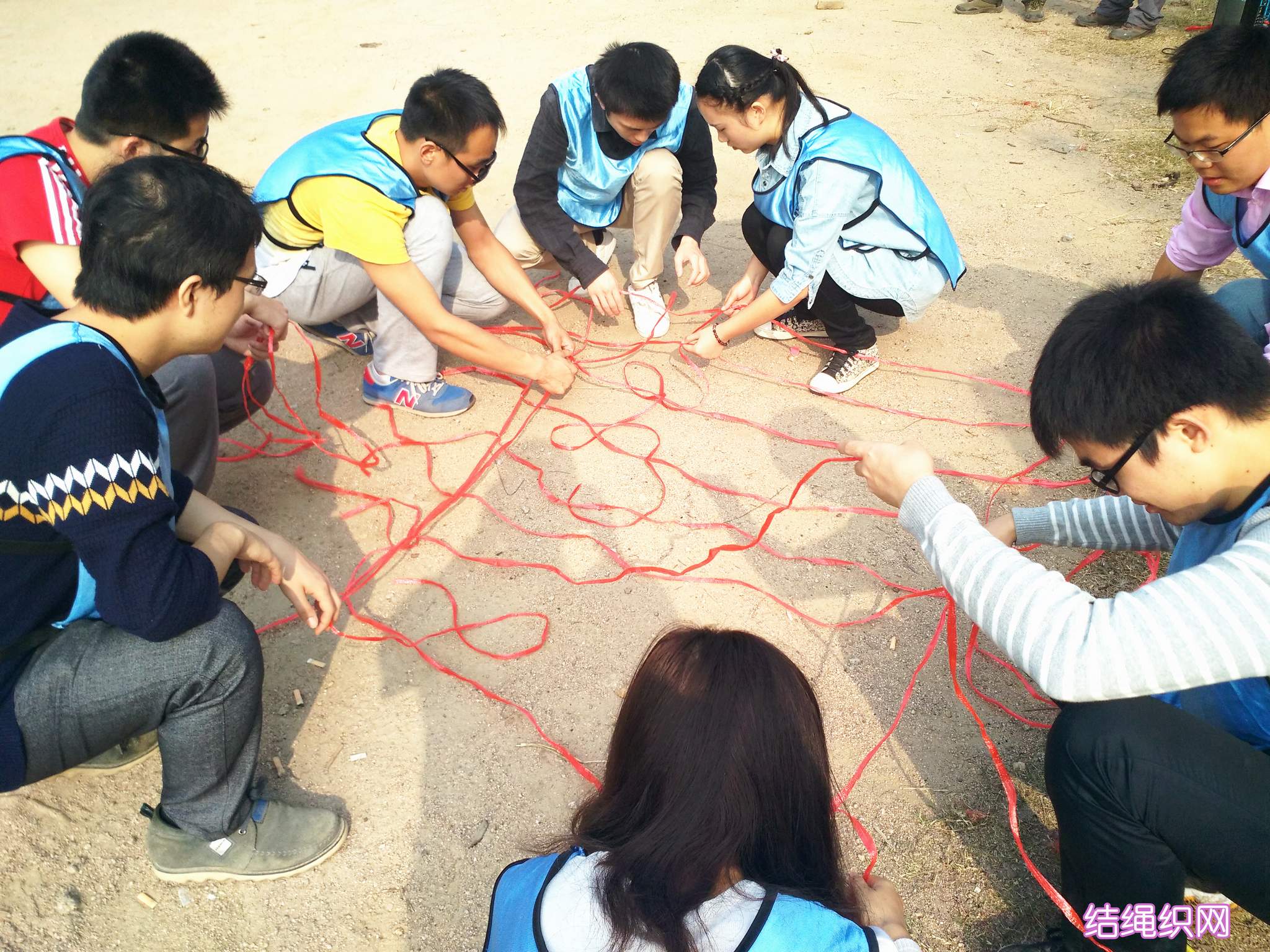 ??? 在抵達活動地點進行了簡單的破冰活動后,新員工們組成了兩支隊伍,并策劃了隊名、隊旗和口號。隨后,在教練員的帶領下,新員工們開始了一系列的拓展活動:“珠行萬里”,隊員們手持半圓形軌道接力將乒乓球運到終點,考驗的是團隊合作能力;“橫行天下”,多人多足的橫向移動,除了默契的團隊配合,也需要一定的技巧;“結繩織網(wǎng)”,細細的尼龍繩結成能承受一個人重量的網(wǎng),是對動手能力和創(chuàng)造能力的雙重考驗。