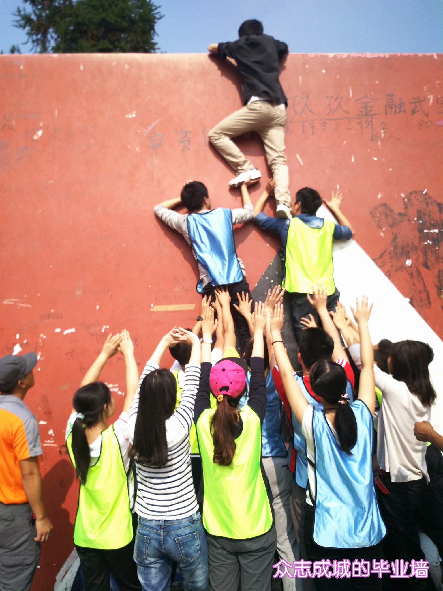 ??? 在最后的“畢業(yè)墻”環(huán)節(jié),大家團結一心,幾名隊員先是搭起了雙層人梯,將幾名隊員率先送上去,剩下的隊員借助人梯,上面的隊員也是又拉又拽,很快,二十幾名隊員便全部成功登頂。
