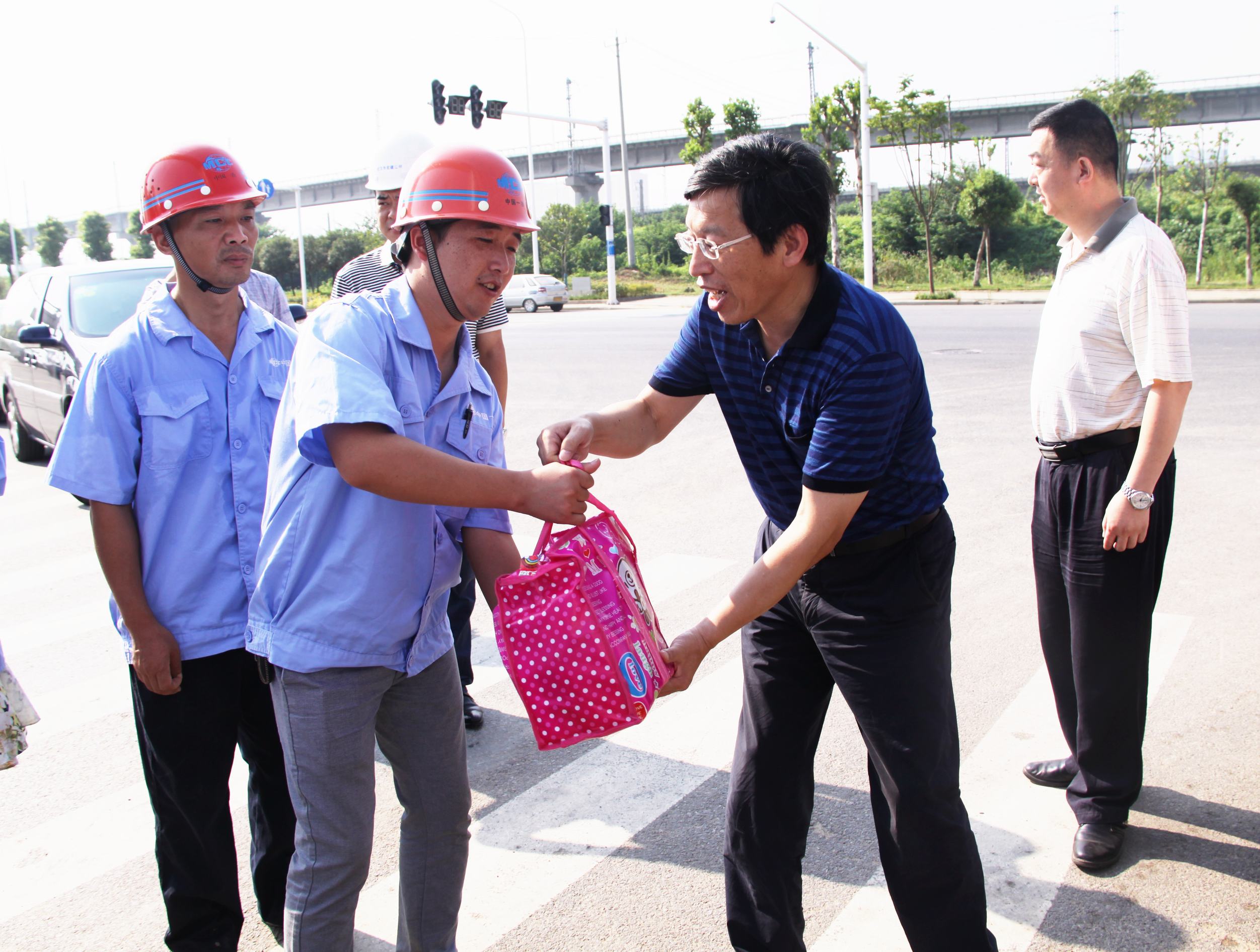??? 蔡輝書記一行先后來(lái)到城華路、漢陽(yáng)海綿城市示范區(qū)、黃家湖污水處理廠等工地現(xiàn)場(chǎng),為堅(jiān)守在現(xiàn)場(chǎng)的員工們送上消暑慰問(wèn)品。公司領(lǐng)導(dǎo)聽(tīng)取了現(xiàn)場(chǎng)負(fù)責(zé)人的工作情況匯報(bào),詳細(xì)詢問(wèn)了員工們的工作和生活情況,并叮囑他們注意高溫天氣下的工作安全。同時(shí)要求相關(guān)部門負(fù)責(zé)人合理安排工作時(shí)間,做好人員調(diào)配,制定防暑降溫工作預(yù)案,保證一線員工的身體健康。