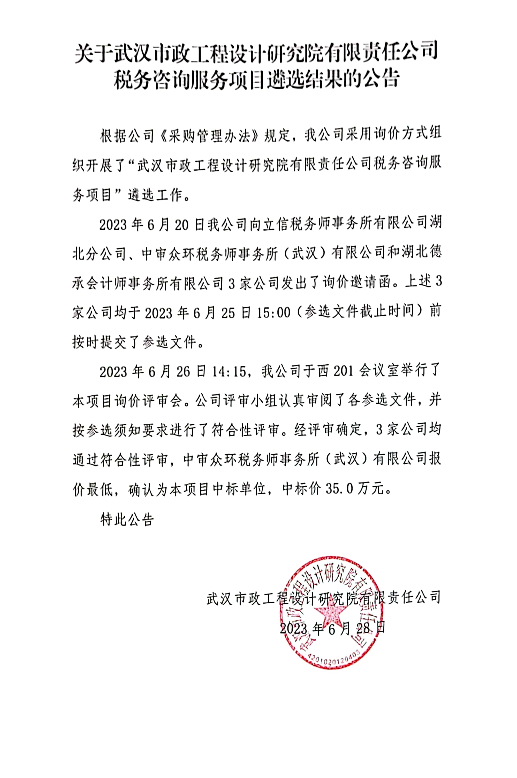 關(guān)于武漢市政工程設(shè)計研究院有限責任公司稅務(wù)咨詢服務(wù)項目遴選結(jié)果的公告